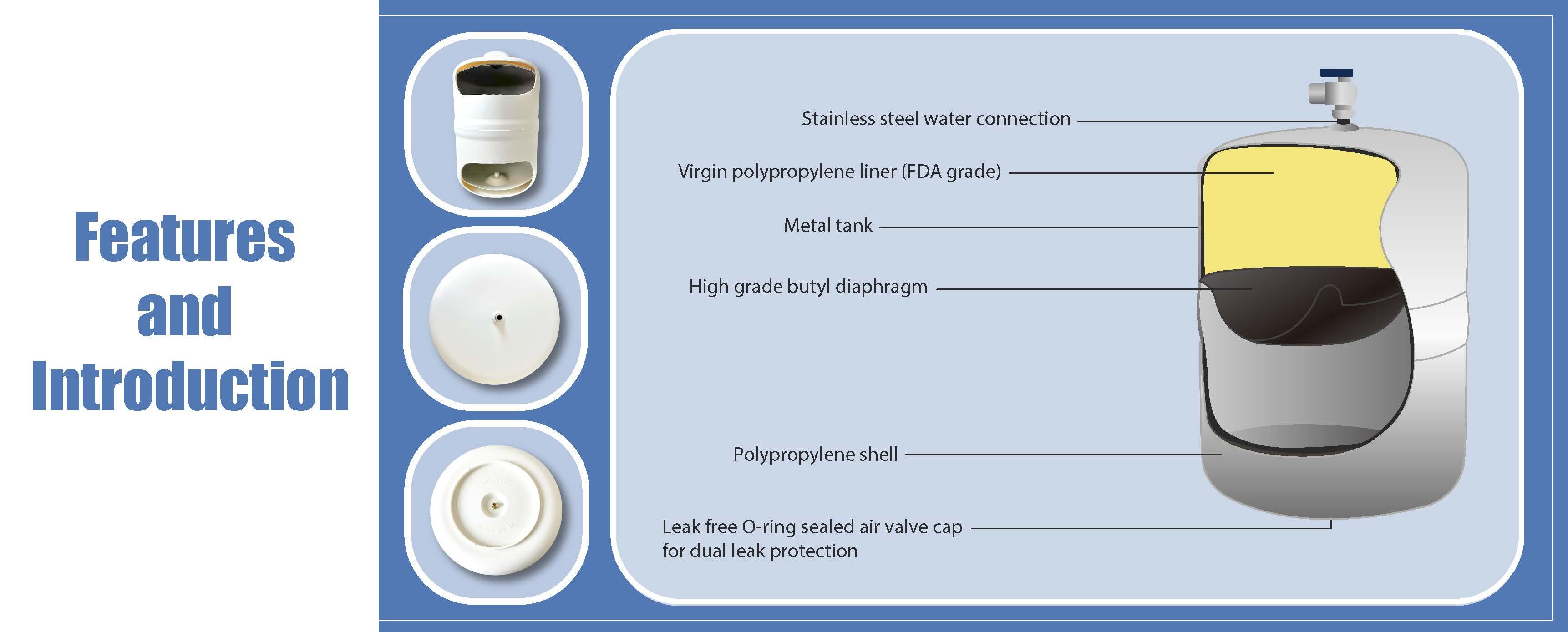 * Certified to NSF/ANSI 58 & CE/PED. Stainless steel water connection (Inlet & Outlet) Virgin polypropylene liner(FDA grade) Metal tank High grade butyl diaphragm
