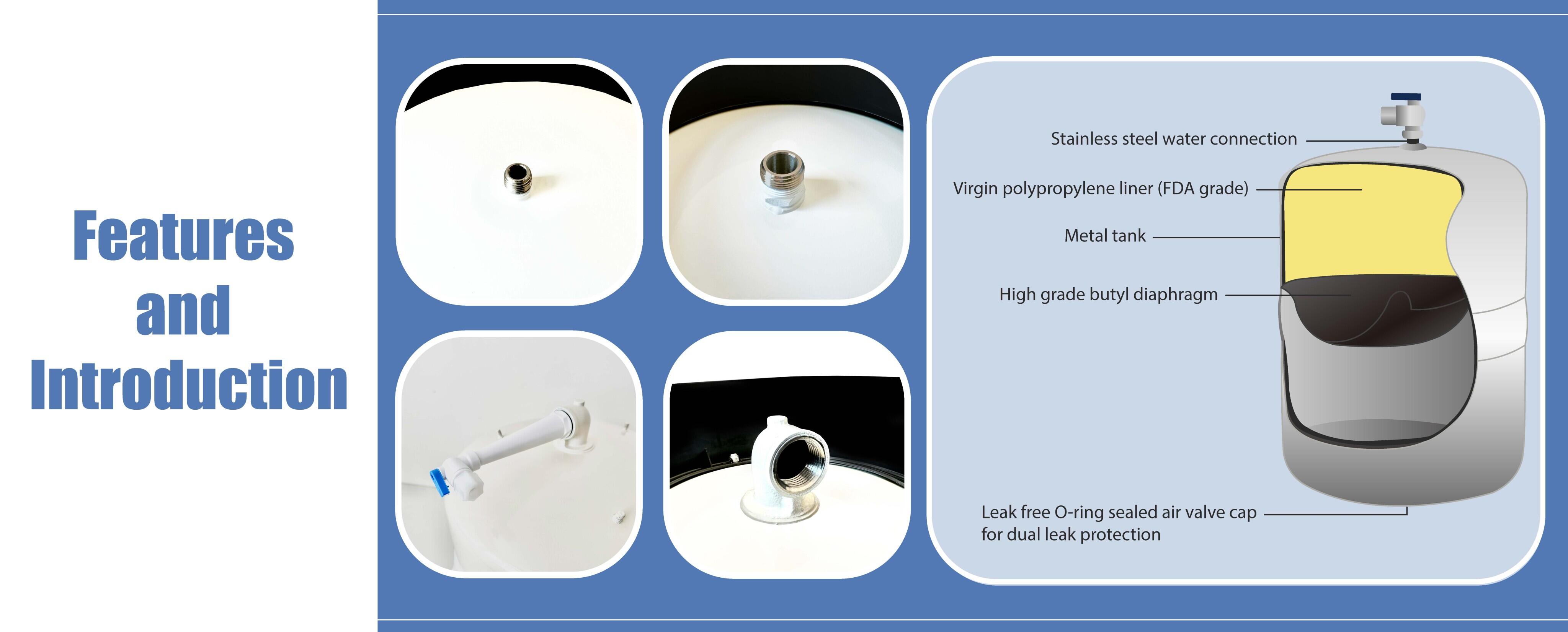 Feature* Certified to NSF/ANSI 58 & CE/PED. Stainless steel water connection (Inlet & Outlet) Virgin polypropylene liner(FDA grade) Metal tank High grade butyl diaphragm
