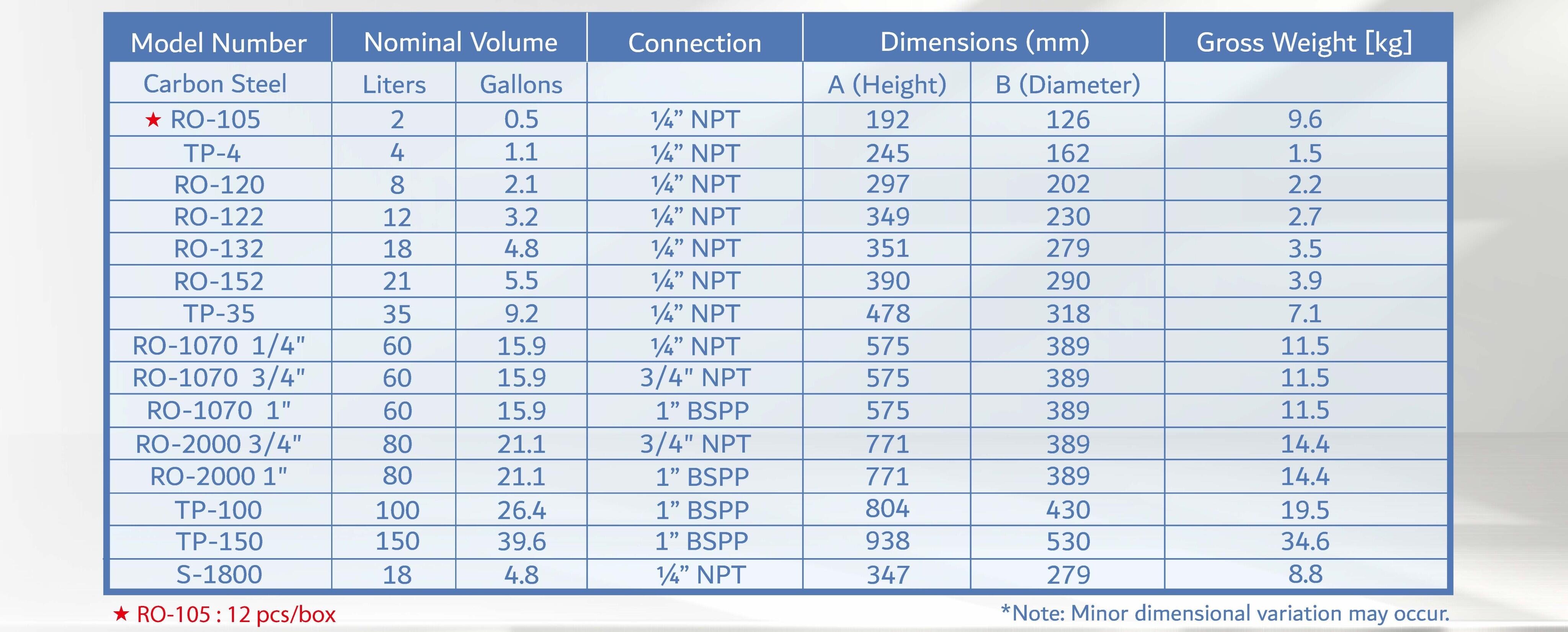 RO-105 | 19.2 | 12.6 | N/A | 1/4”NPT | 1/4”ball valve | 2 | 0.5 | 0.049 | 11.47 | 12 pieces/carton | 504 pcs/board |
