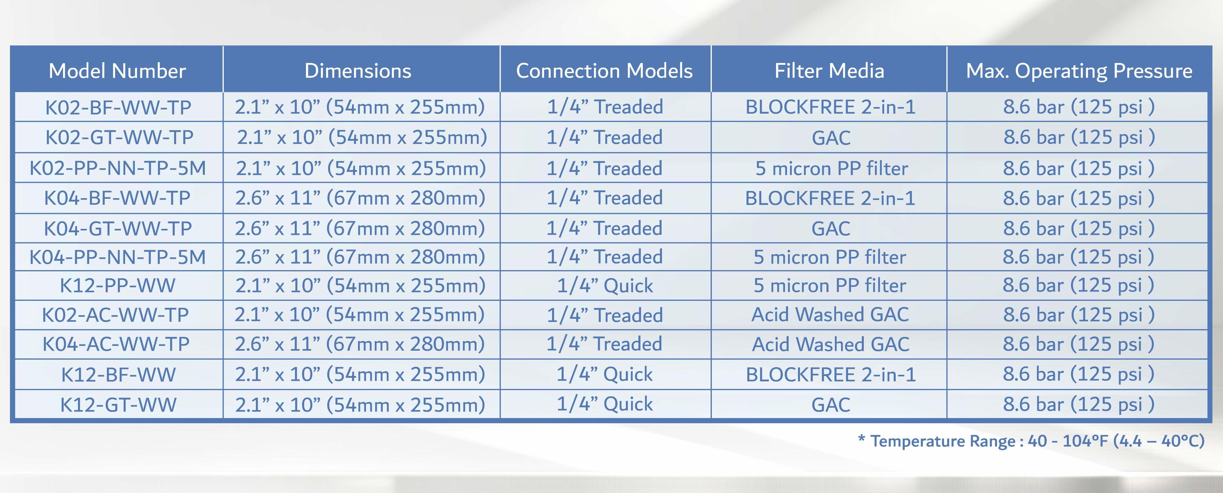| K14-PP-WW | 1/4” Quick | 5 micron PP filter | Individual Box × 25 pcs | 1125 pcs |